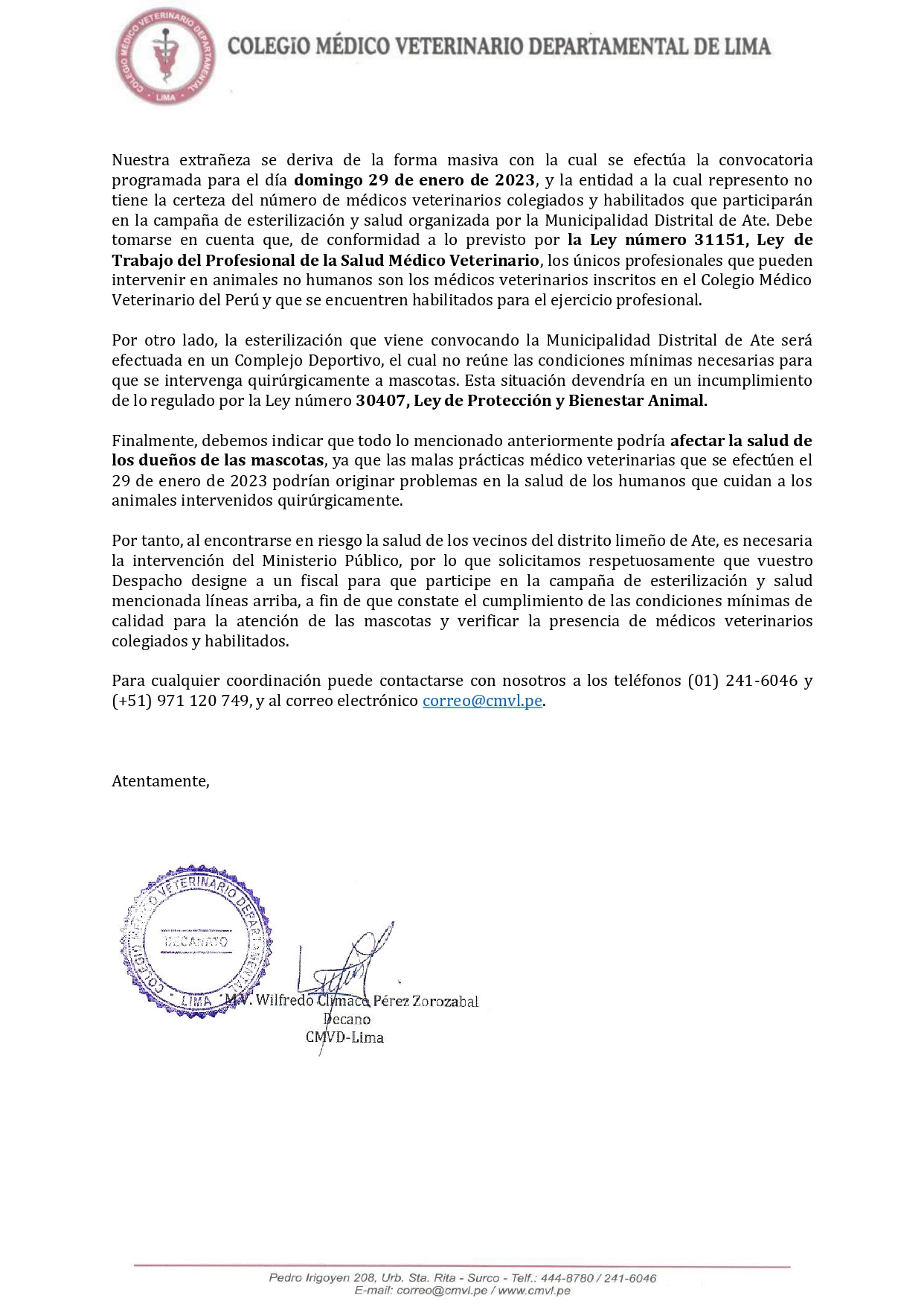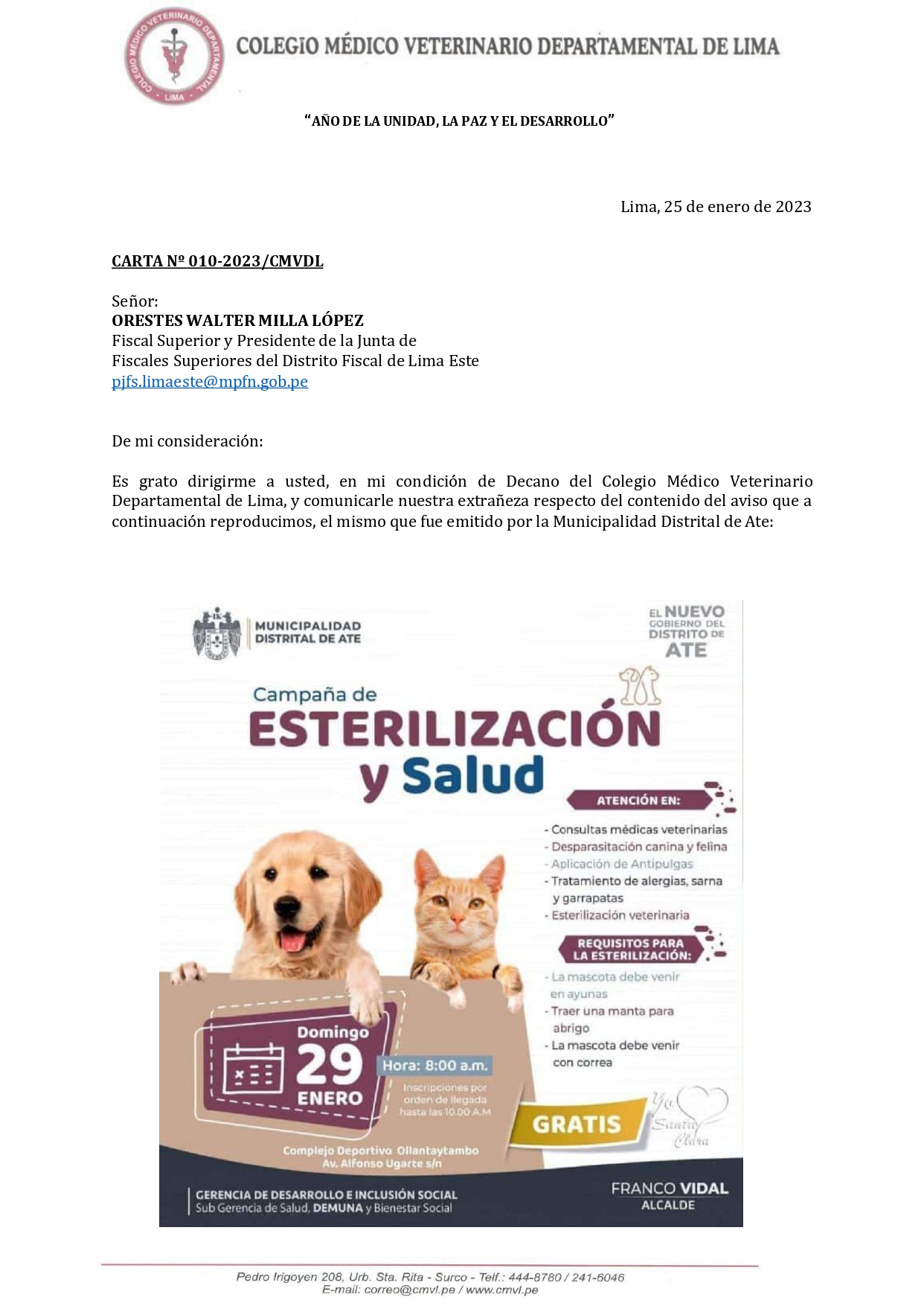Por ello, informamos que, en fecha 29 de enero del presente año, la Fiscalía de Lima Este a solicitud del Colegio Médico Veterinario Departamental de Lima, se apersonó al lugar donde se realizó la campaña de esterilización de mascotas, ubicado en el Complejo Deportivo Ollantaytambo, distrito de Ate Vitarte.